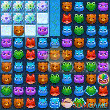 1、第一步:三消除雪块向下推进,赶走雪怪释放清屏特效收集钥匙。